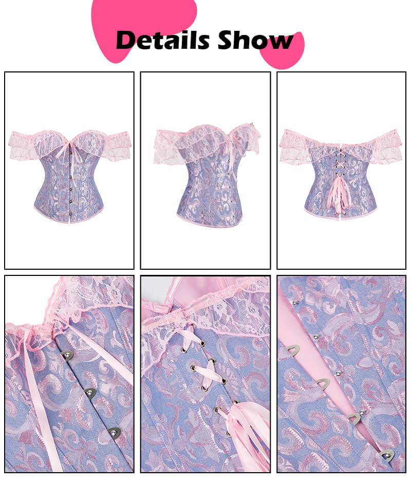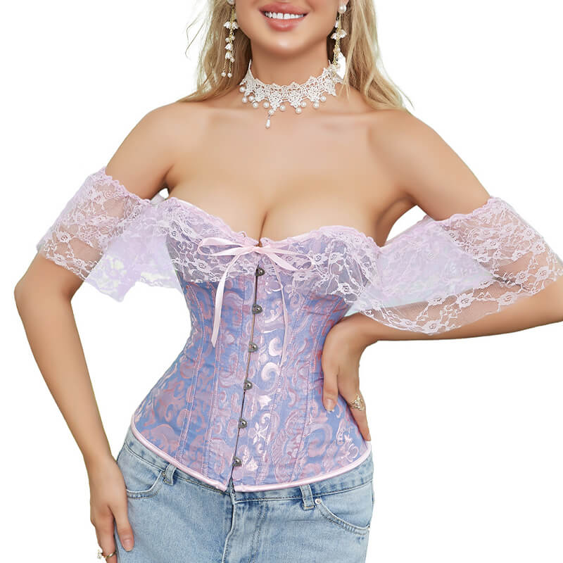 1. Elegant Off-Shoulder Design: This lace corset top in regal purple features a custom fit and intricate floral detailing, exuding confidence and style.