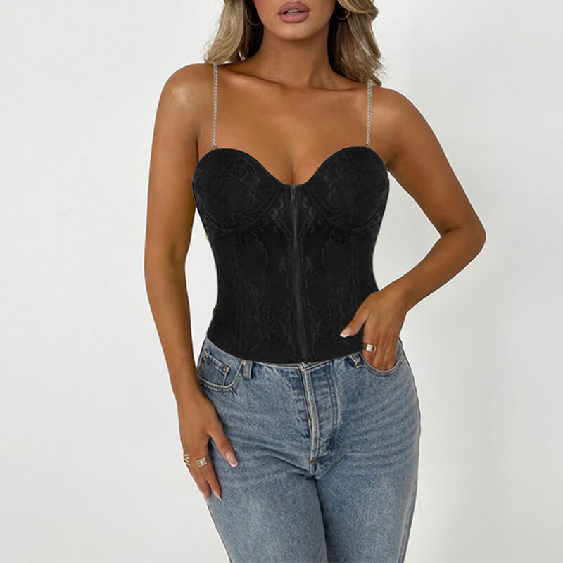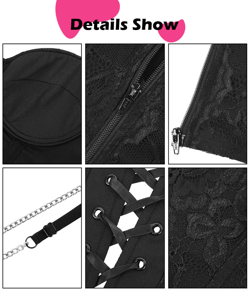 Design: Zipper closure. Vintage Lace Corset Top, Tie Back, Vintage Floral Print, Boat Neck, Lace Trim Underbust Corset for Women, Retro Court Style, Make You Look More Elegant and Glamorous!